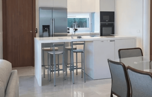 Kompletní proměna interiéru s moderními dlažbami, světlými prvky a praktickým, vzdušným uspořádáním pro pohodlný každodenní život.